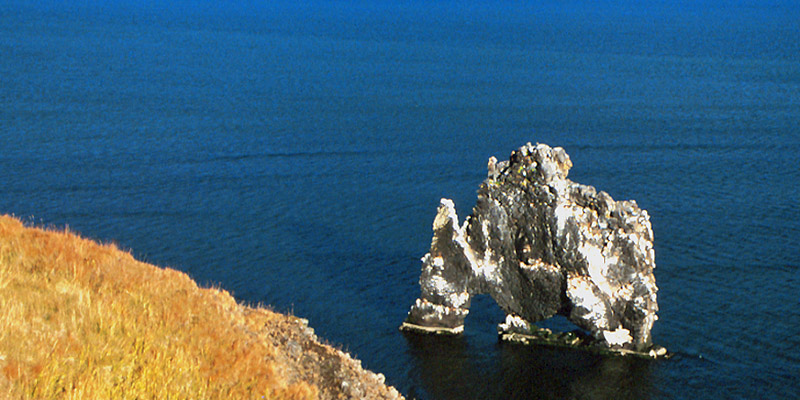 October 1999 We left Reykjavík at about 9:00, through the tunnel under the fjord to the north of town. We stopped for gas in the suburbs and shortly found ourselves in the wilds of Iceland. In the middle of a lava field, a sign-posted trail led up to the rim of a volcanic crater called Grábrók. Two other cratered cones stood nearby. At about noon we pulled into the town of Hvammstangi to visit the post office and the bank, and to have lunch. There was one restaurant in town, with precisely one menu item available---fish and chips, virtually identical to last night’s dinner. We were the only customers. I gather that Icelanders don’t go out much during the week. Off we went in pursuit of Hvítserkur, a sea stack shaped like a great grazing buffalo (a petrified troll in the Icelandic imagination), which my guidebook led us to believe was a few miles up the road from Hvammstangi. The pavement ended just outside town, but the dirt road was well maintained. A few miles farther than we’d thought the mighty buffalo would be, a sea stack jutted up above the coastal bluff. We made our way laboriously down to it; it wasn’t Hvítserkur. Another few miles on, the road deteriorated considerably. It became apparent that a major reconstruction project was going on. At points the undercarriage dragged on the loose sand and rocks, and we feared getting stuck. Before long we were entertaining thoughts of being stranded at the end of the earth. Finally, we came upon the construction workers responsible for the mess. I showed one the picture of Hvítserkur in the guidebook and asked him how far. He showed me varying numbers of fingers and said “ten”, then “fifteen”, then “eight”. In retrospect, I think I was supposed to multiply these. At least the crew hadn’t gotten around to destroying the road beyond that. Around the tip of the peninsula we drove. Suddenly, Win found the beast on the map; we’d never spotted it because it was on the opposite side of the peninsula from where we’d thought it would be. Finally, we arrived at the sign-posted trail, and cursed the errant buffalo all the way down. But Hvítserkur itself was pretty spectacular, and the sun smiled on us as we took pictures. A short time later, the road climbed up the shoulder of a high knoll, and we stood at the foot of Borgarvirki. In a horseshoe of hexagonal basalt columns, Vikings had built, some 900 years ago, several buildings and a well, all now in tumbled ruins. They fortified the gaps in the crater wall. The site dominates the valley, with magnificent views of mountains to the east and west and the fjord to the north. We lingered despite the strong cold wind, enchanted by the mystery of this place. It was late afternoon by this time, and it was apparent that we were going to be quite late into Akureyri. We had two hours yet to drive, so we drove hard and fast the rest of the way. We crossed the head of another fjord, Skagafjörður, just after sunset and drove up into a pass in the snow-peaked mountains in the eerie blue twilight. We arrived in Akureyri at about 8:00, found a room and dinner, and now sit in a kaffi (café) sipping seven-dollar Guinnesses served by the blond and beautiful Birna. Next |