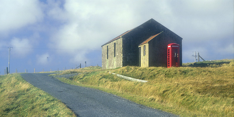 | Phonebox In The Middle Of Nowhere...a fairly common sight in rural Britain. Unlike in the US, the phone company in the UK is expected to maintain phone boxes in remote places. The more remote (and therefore unprofitable) the box is, the more vital it is in an emergency. This is the one at Culswick, at the beginning of the walk to the broch. The building it stands next to is a total ruin, but the phone is fully functional. |