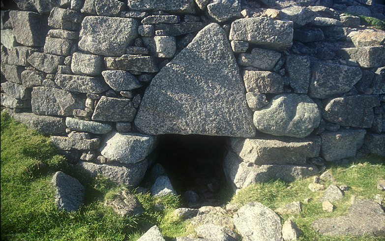 | The broch at Culswick is largely a pile of rocks. However, a few architectural features are visible, most notably this massive triangular lintel over the half-buried entrance. |