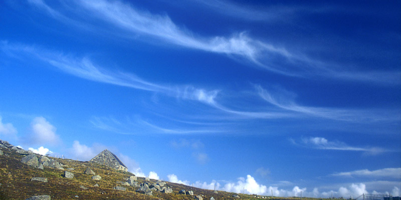 | Almost back to the gate, a stone house sits on the hill above the track. If memory serves, it is a meeting hall for a Protestant denomination unusual in Scotland--Baptists, maybe. [Methodist, actually.] Mare's tails swept the sky. |