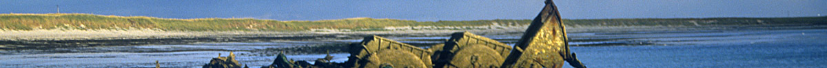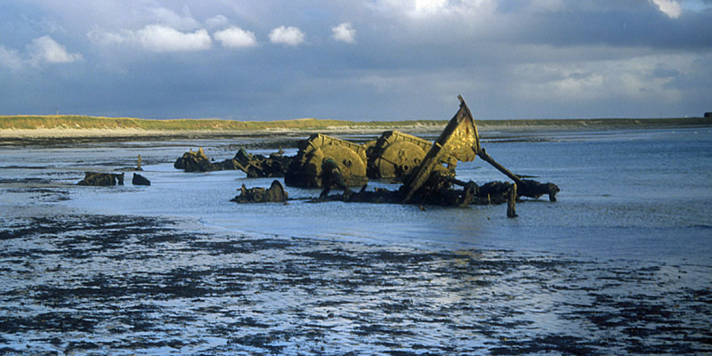 give Sanday its name, with a view of the largely sunken remains of a German
