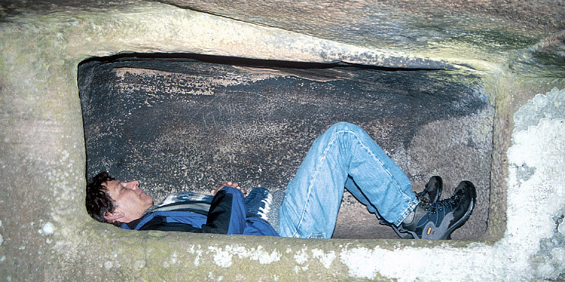 single large boulder. We crawl through the opening and find two rectangular