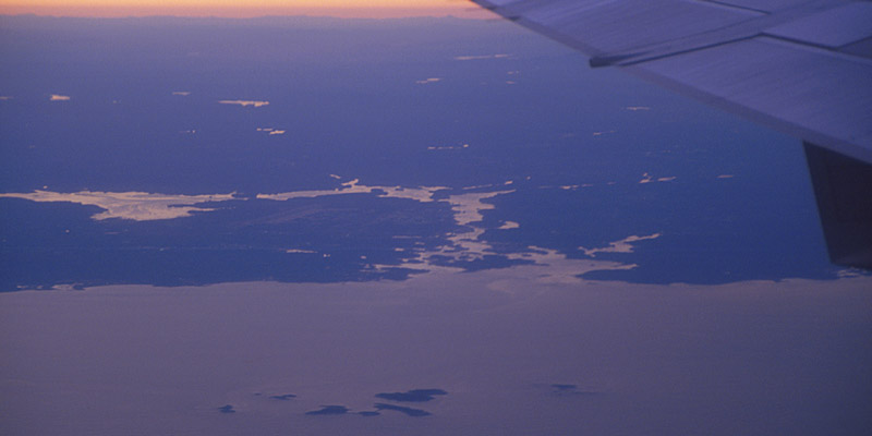 | Sunday 26 September, 2004--Win and I are off for eight days in Norway (or so we think). We have both been dreaming about Norway for years. It's the Viking homeland, the eastern terminus of the North Atlantic Arc. Leaving Boston, we are treated to wonderful views of the New England coast, including Portsmouth, New Hampshire, home of our good friend Scott. We asked him to come with us. We always ask him to come with us. He never comes. We wave as we fly by. |