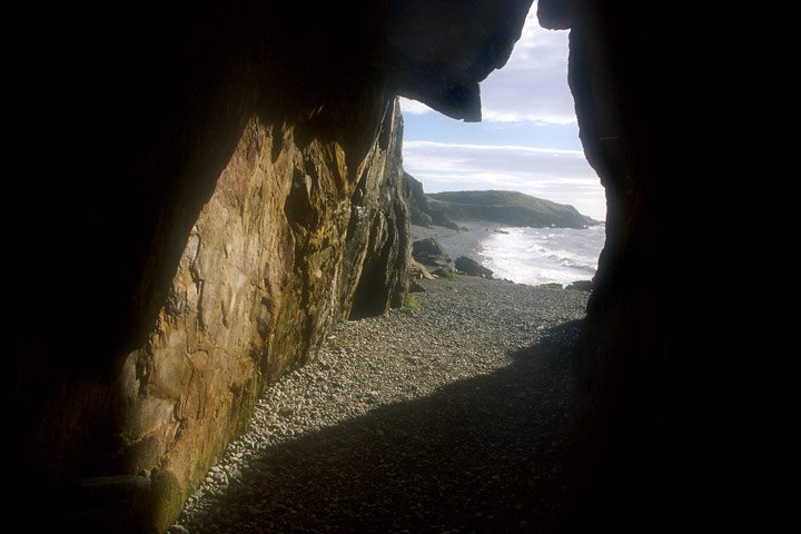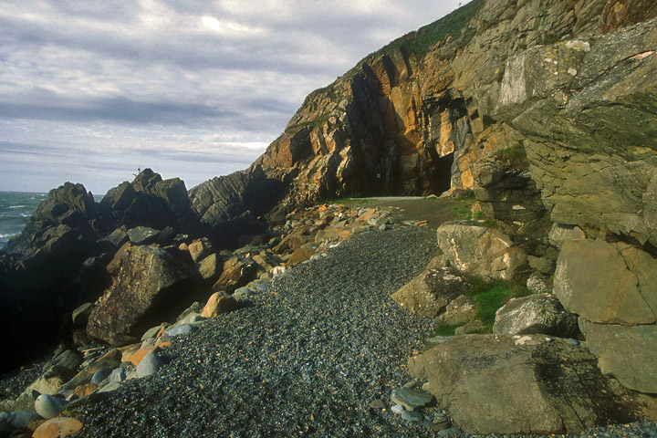 from the car park to a shingle beach, then a few hundred yards to the cave, a crevice in the cliffs. I pick over the
