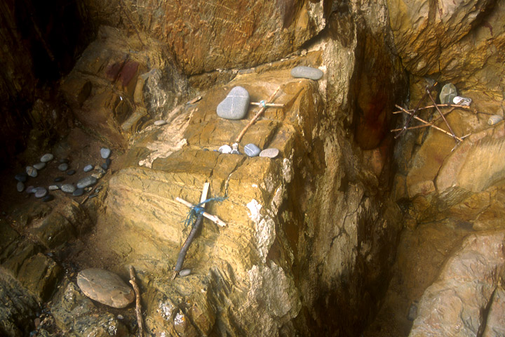 I arrive at the cave and notice that visitors have constructed various little shrines of sticks and stones, and