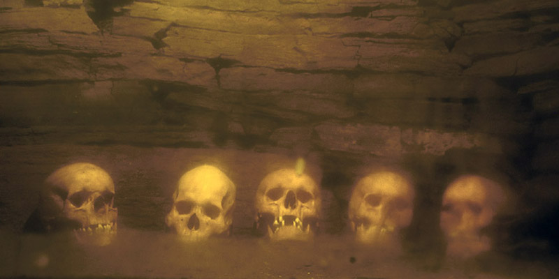 covering it, behind from which several skulls grin out at us. These dudes, like the fellow shown to us in the museum, are about