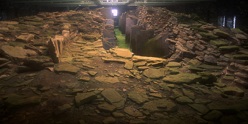 fields to a large, hangar-like building. This houses the remnants of the Mid Howe Cairn, a hundred-foot long stalled cairn,