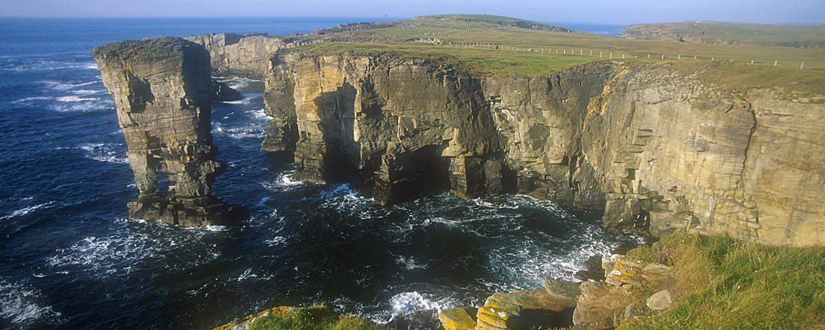 At Yesnaby, the afternoon sun once again lights up the west-facing cliffs, and we walk south this time to view