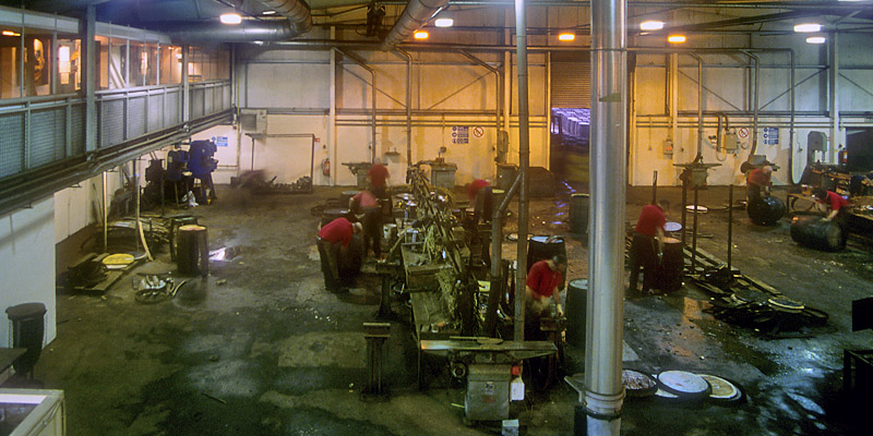 mostly bourbon barrels from the United States, most of the work here is rebuilding and repairing. As we watch from the