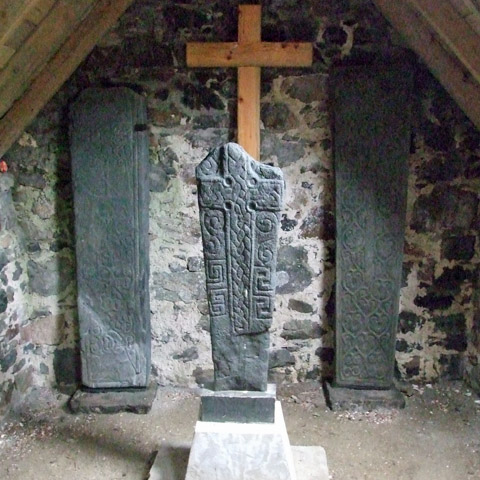 some grave slabs and the replica of an impressive Norse cross slab, cross carved on the front and runes on the back. The
