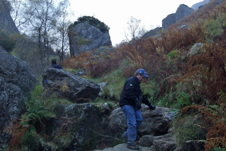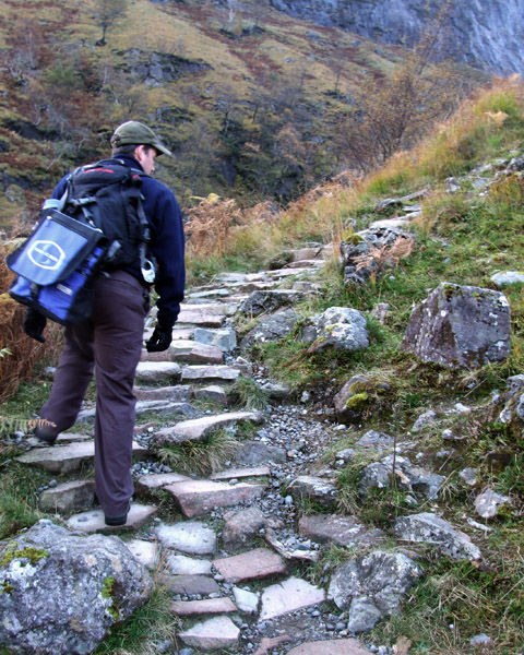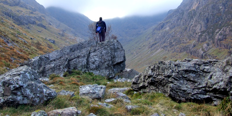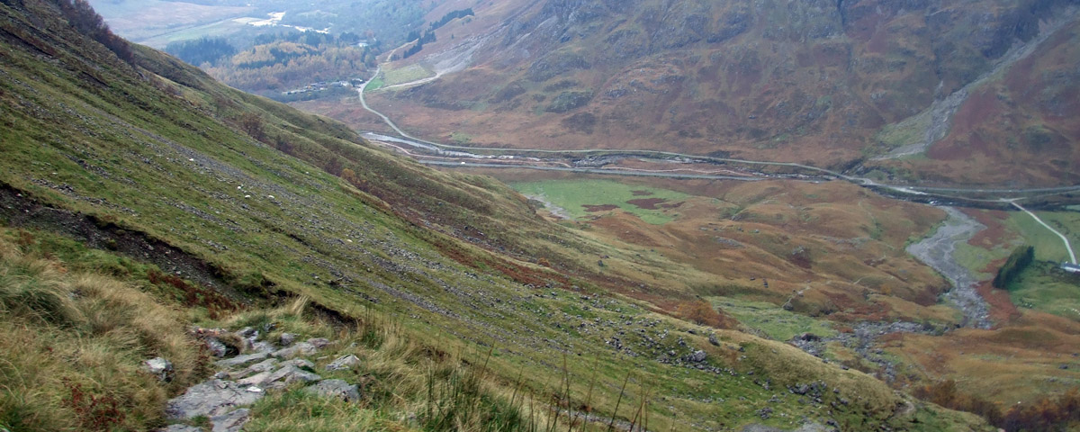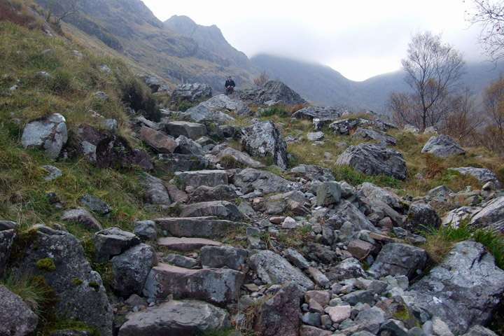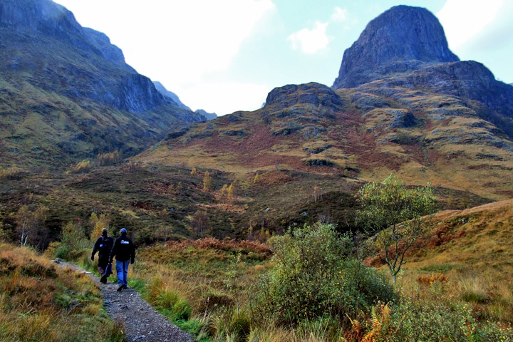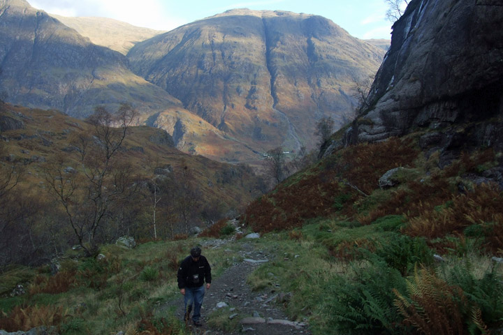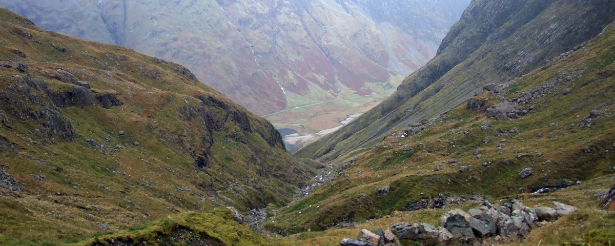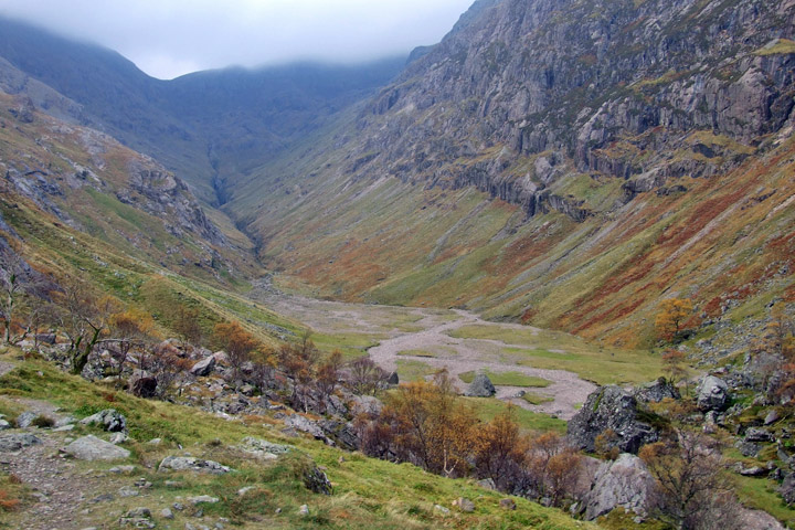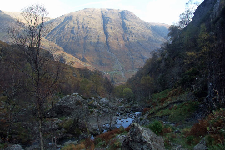 have plenty of time to compare notes. We cross the River Coe and ascend towards Coire Gabhail, the Lost Valley (or Hidden