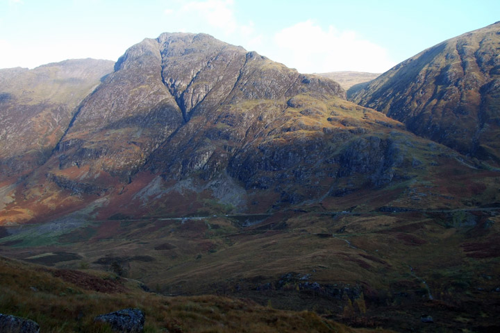 up the glen to a parking area below the Three Sisters, buttresses extending from Bidean Nam Bian's massif. Our plan is to