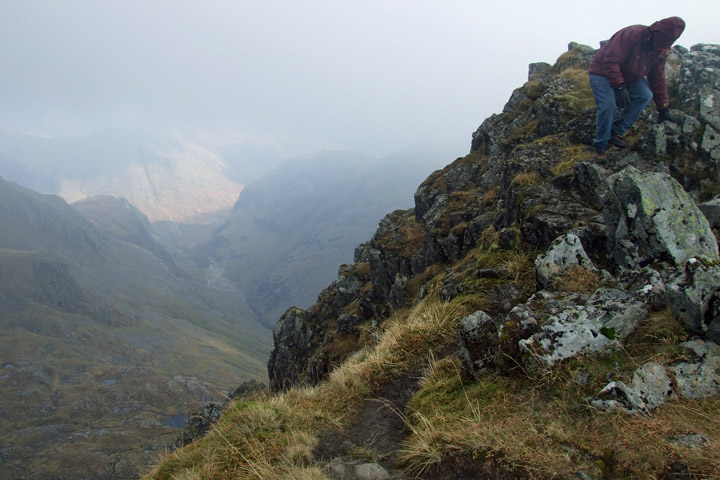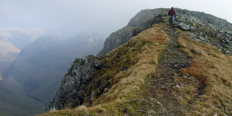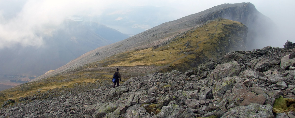 breaks occasionally, giving us tantalizing views down Glen Etive, on the other side of the ridge. Eventually, though, we