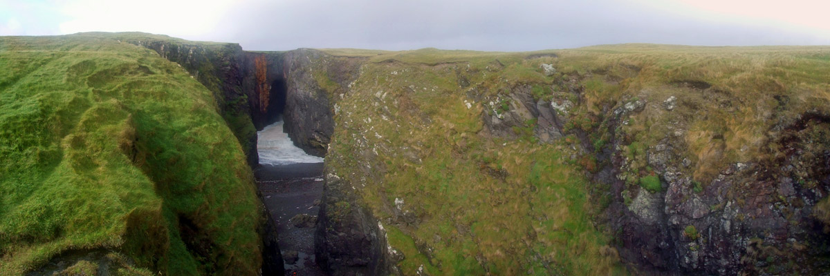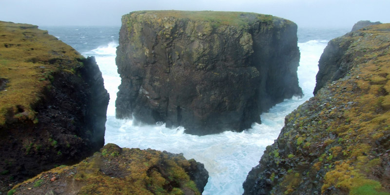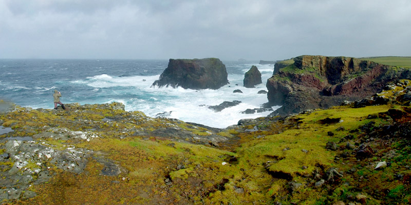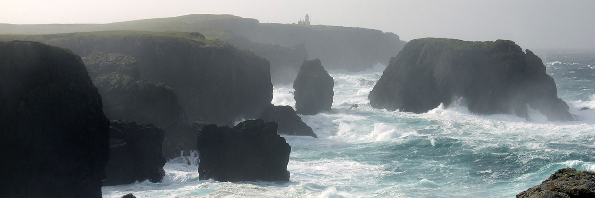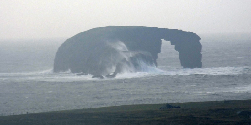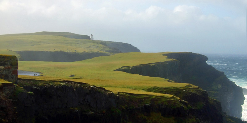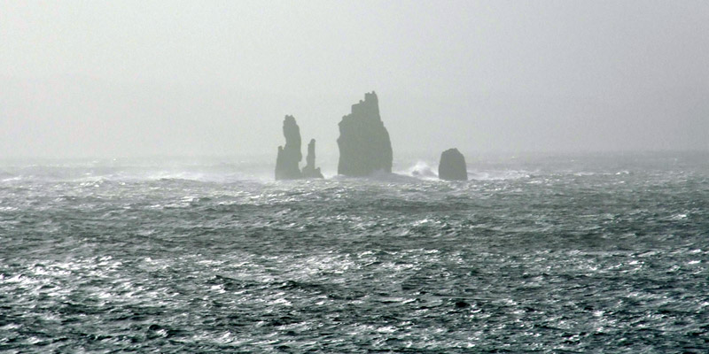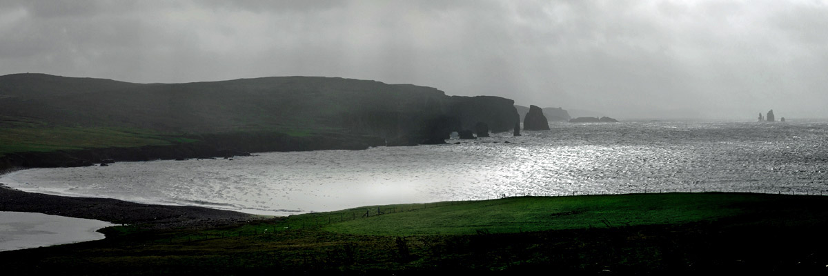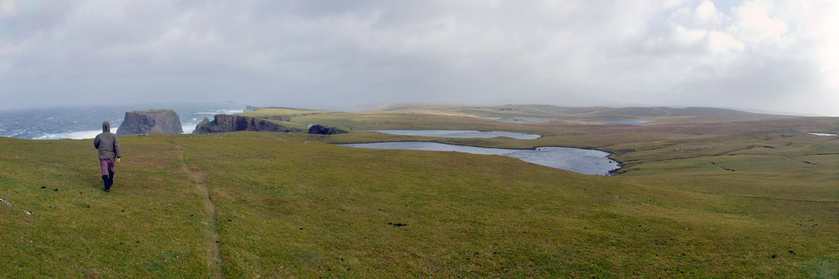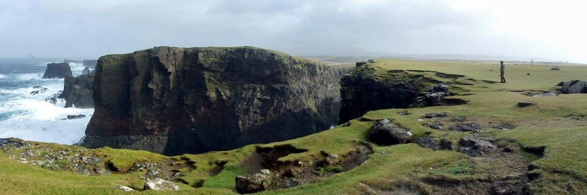 the way, we see spectacular sea stacks in the distance, the Drongs and Dore Holm. The latter is said to look like a drinking