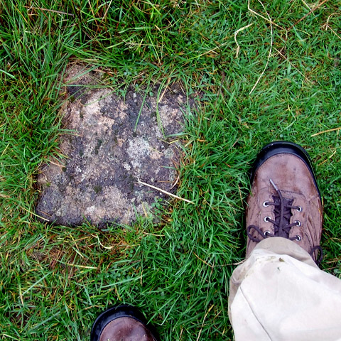 I'm on follows the path of the road, but occasionally square-cut paving stones jut up through the grass. In other places, the