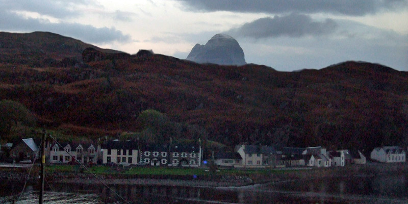 arrive in Lochinver at 5:45 and find my guest house. The view out the window is of the village waterfront, the peculiar dome of Suilven