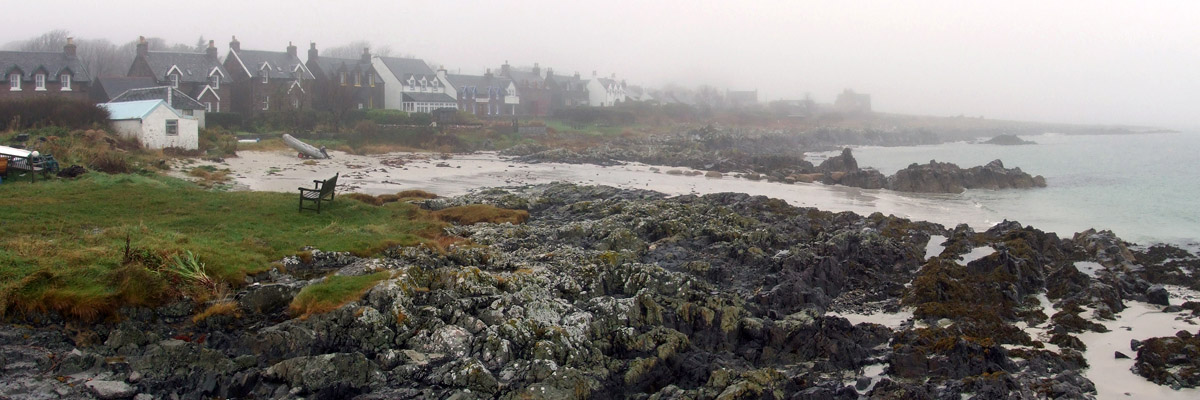 Back across the golf course and past the B&B, I walk the road into the village, known locally as Baile Mòr, the Big Town. It is, of course, the only town on the island, and it's really difficult to imagine a context in which it would qualify in any way as big. On the way in, I pass the Martyrs Bay Restaurant & Bar, where I had dinner and pints last night. This seems to be a recent addition to the island's amenities. The building's exterior is charmless pebbledash, and the interior is a bit sterile, but maybe it's just not sufficiently lived-in. It's the only pub here, comfortable enough, and I'm grateful for it.