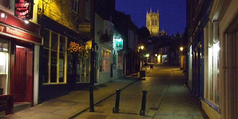 The historic center of Lincoln is atop a hill, reached, in the direction I'm headed, via a very steep street called
