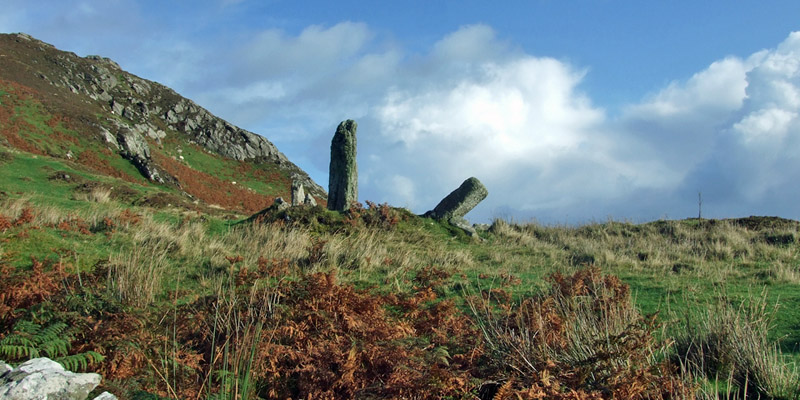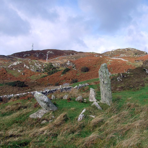 the remains of a chambered cairn. To the west, we can see the green, flat-topped peak of a hillfort. We'll check that out later.