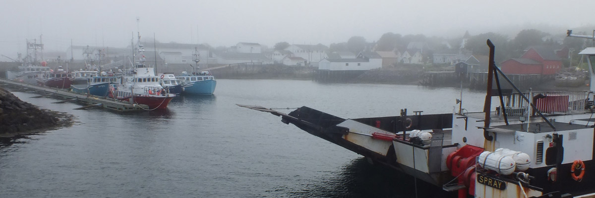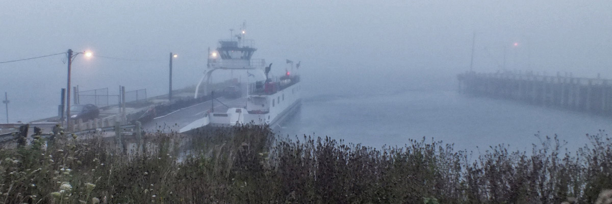 The ferry emerges from the evening fog, and to foggy Westport it returns, with me on it. A full day here has been enough to see the island,