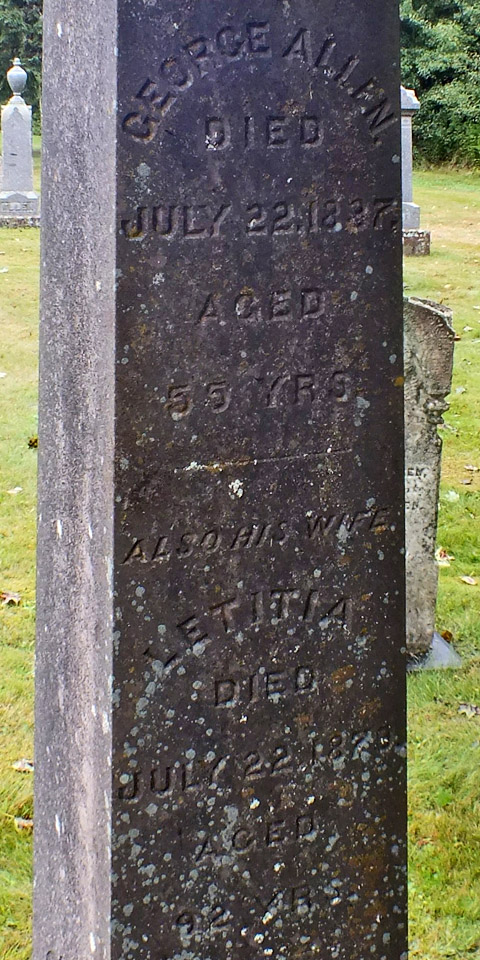 Mosquitos feast on my blood as I wander through the stones. The big find here is the marker for George and Letitia Allen, my great-great-great-great