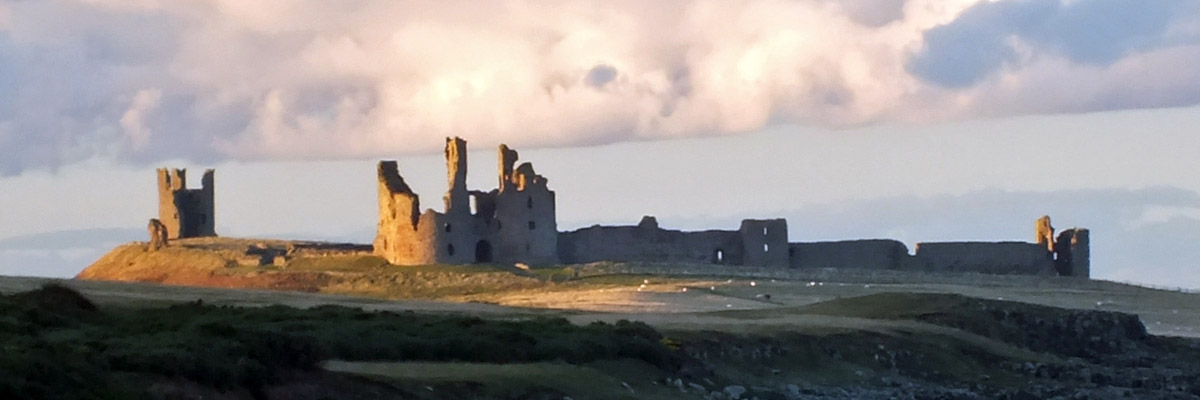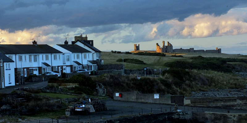 early evening sun illuminating Dunstanburgh Castle. I take a few photos, one eye out for the taxi. We return to the front of the pub and wait...and