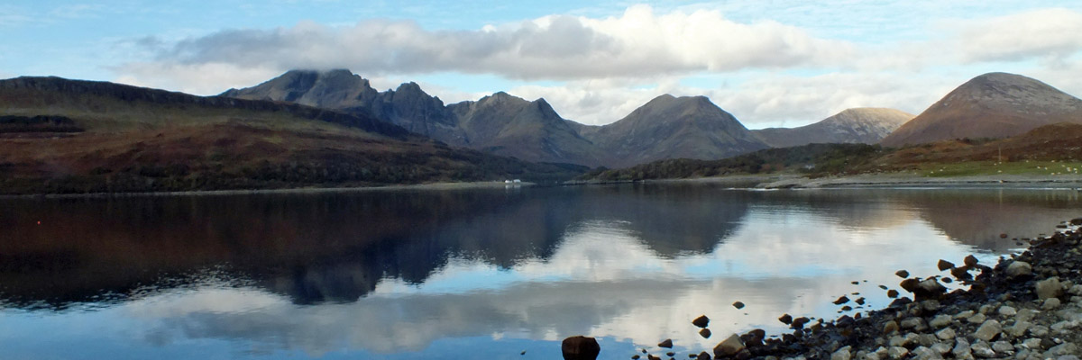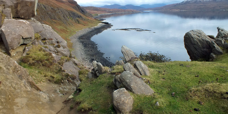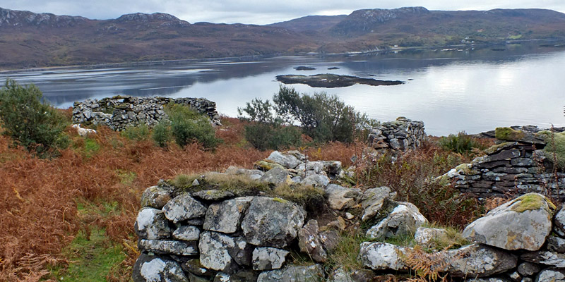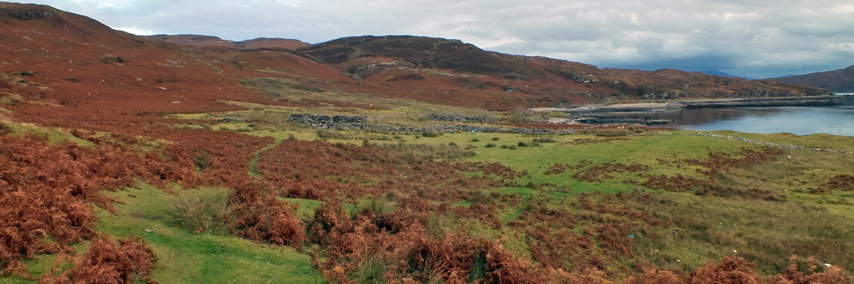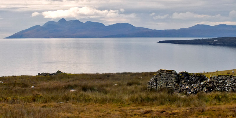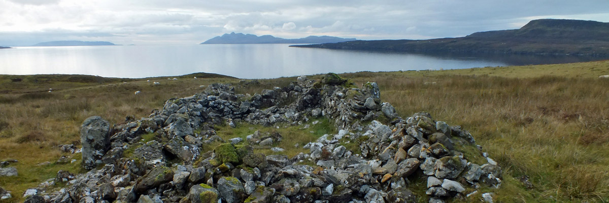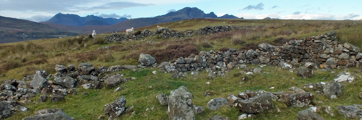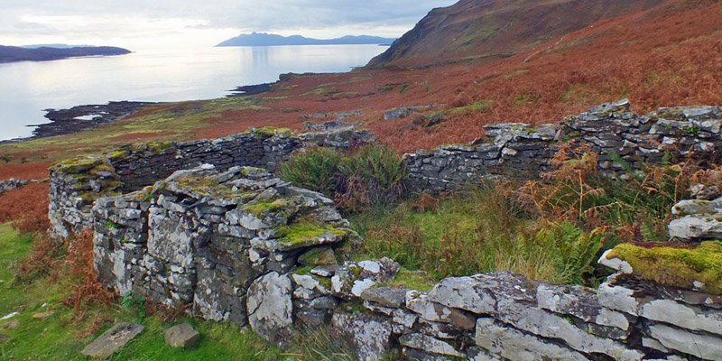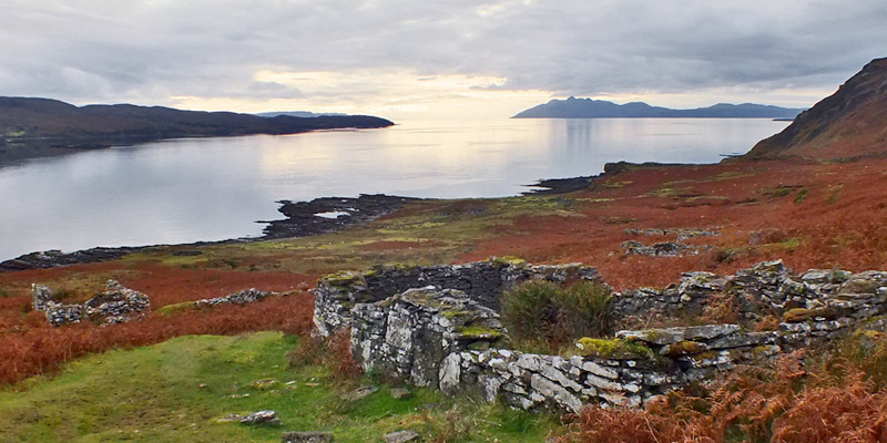 Boreraig lies in a bowl looking south over Loch Eishort. The remnant of a dun along the shore hints at many centuries of habitation. The site is