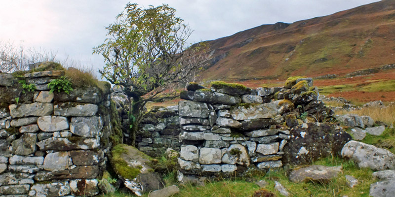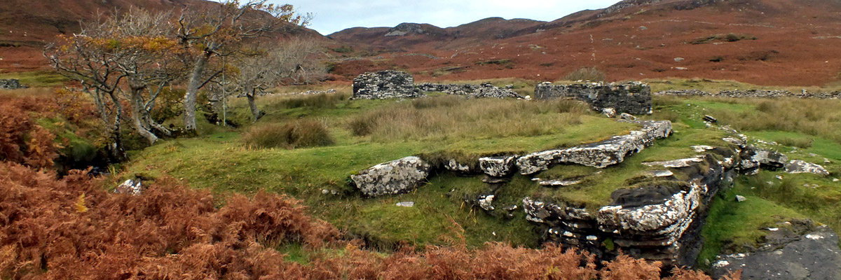 the track on foot, two miles to the remains of the cleared village of Suisnish. The houses here have been reduced to rubble; the perimeter fence is