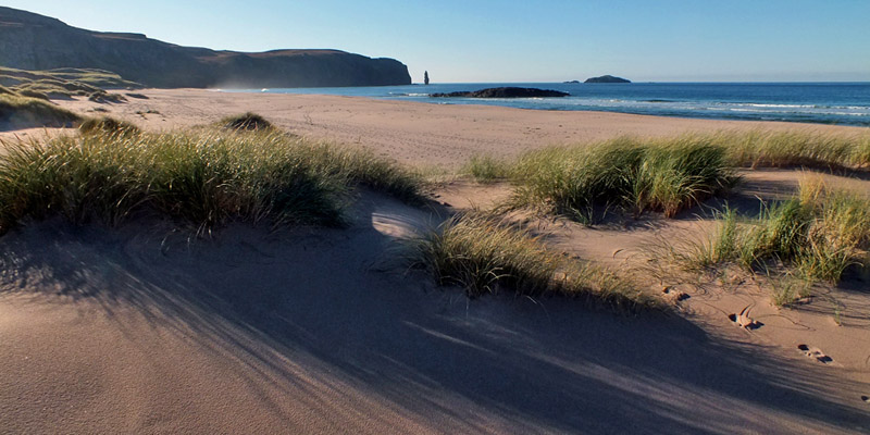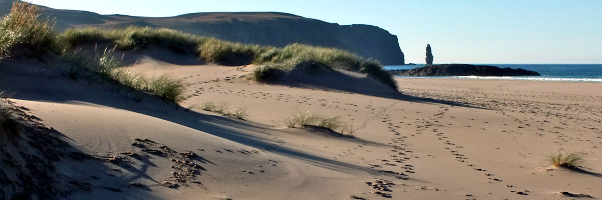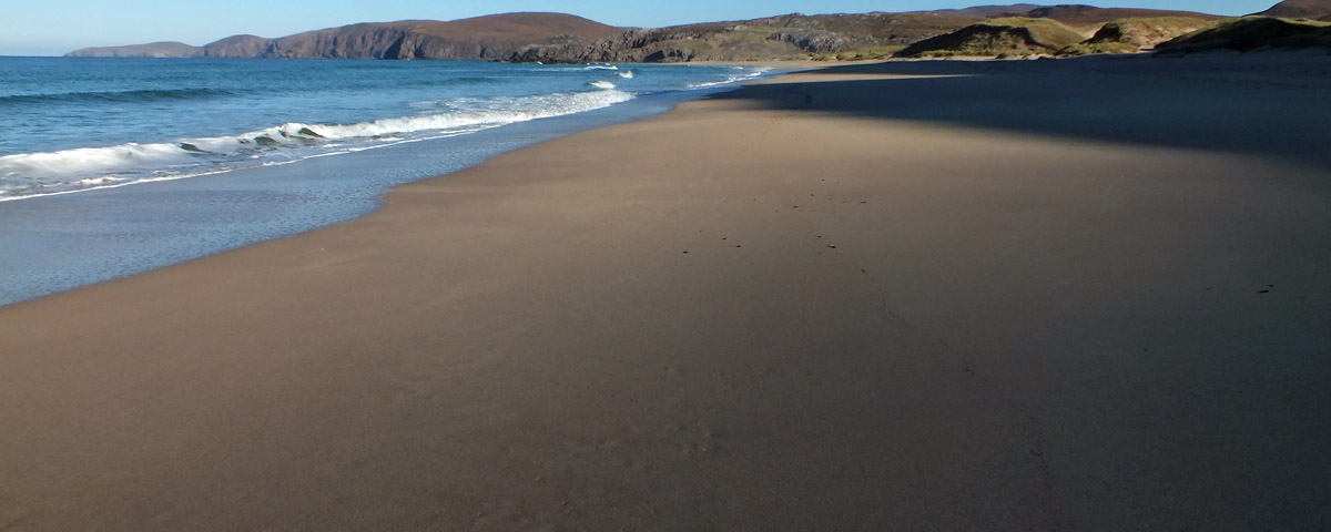 really see snow on the hills a few days ago? An hour or so along, the ruin of Sandwood Cottage appears, and I catch the faint sound of surf. Then the bay