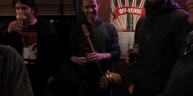 the mini-keg of home-made cabbage spirit slung over his shoulder. He is giving