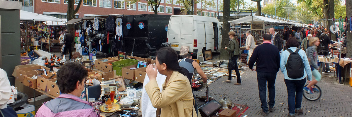 full of antique shops and land in Waterlooplein, where there is a flea market. Scour the stalls for a hat, to no avail. There are hats, of