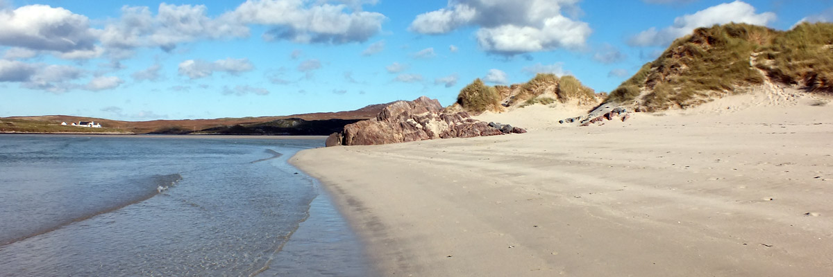 surprisingly steep-sided two-mile scar of Glen Valtos. At the far end, the broad, flat expanse of Tràigh Uuige, the Uig Sands, fills its nearly closed-in bay. Beyond, the southwestern corner of Lewis looks to be more of a piece with northern Harris, from which it is separated by the narrow Loch Resort. We stop and walk for a bit on the beach. It has a reputation as one of Scotland's most beautiful, but to be honest, I am not so beguiled. It's nice enough, but suffers, I guess, in comparison to the spectacular Harris beaches.