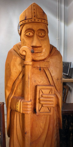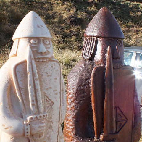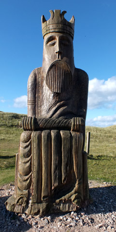 Tràigh Uuige is famous for the discovery of the Lewis chessmen, 93 pieces carved from walrus ivory and whales' teeth, in the early nineteenth century--exactly when (and where) is lost to history. Believed to have been made in Trondheim, Norway, they are now displayed in the British Museum in London, and the National Museum of Scotland in Edinburgh. There are several large carved wooden replicas about--these play a significant role in May's The Chessmen, the third novel in the trilogy--including a bishop inside the