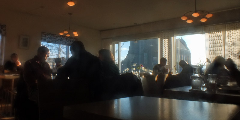 and the pond is covered with a thin layer of ice. We have lunch at Café Loki, with a view through steamy windows at Hallgrímskirkja.