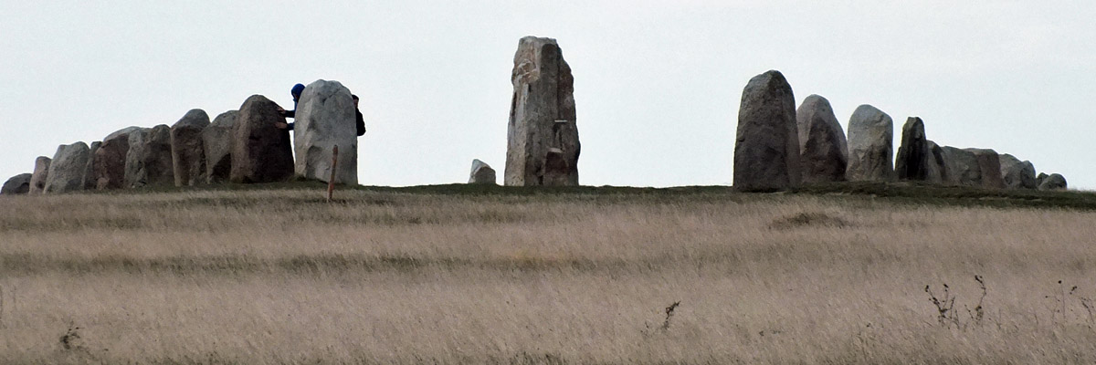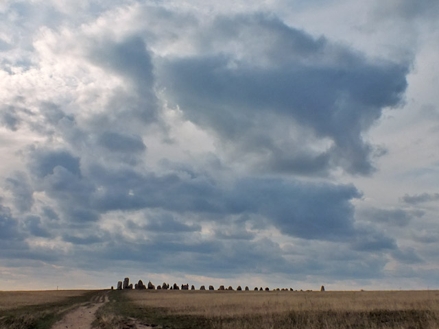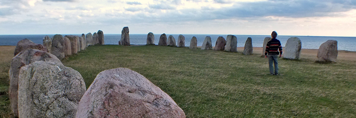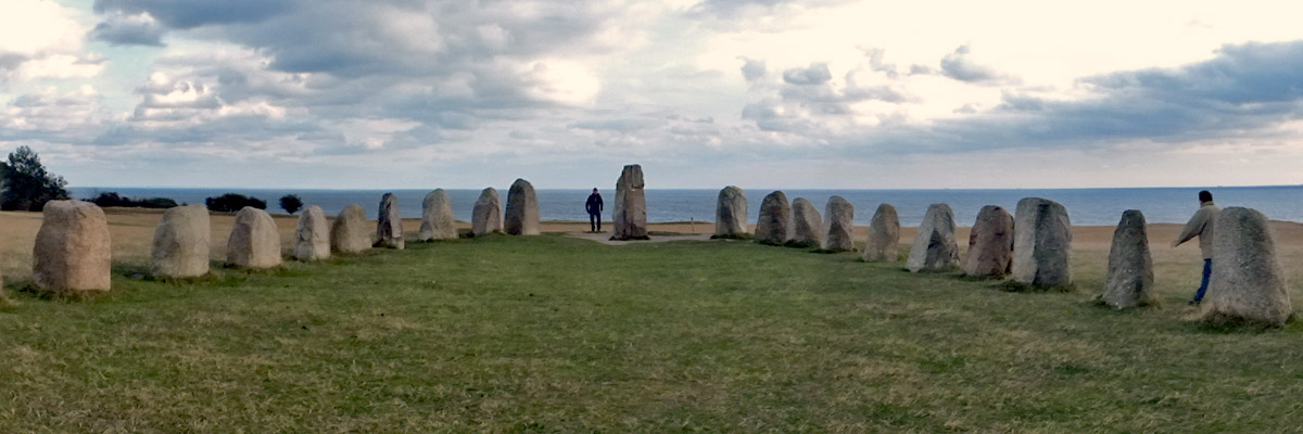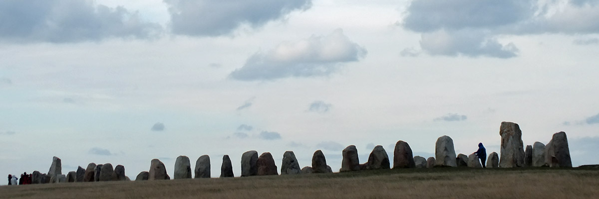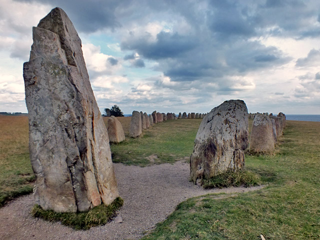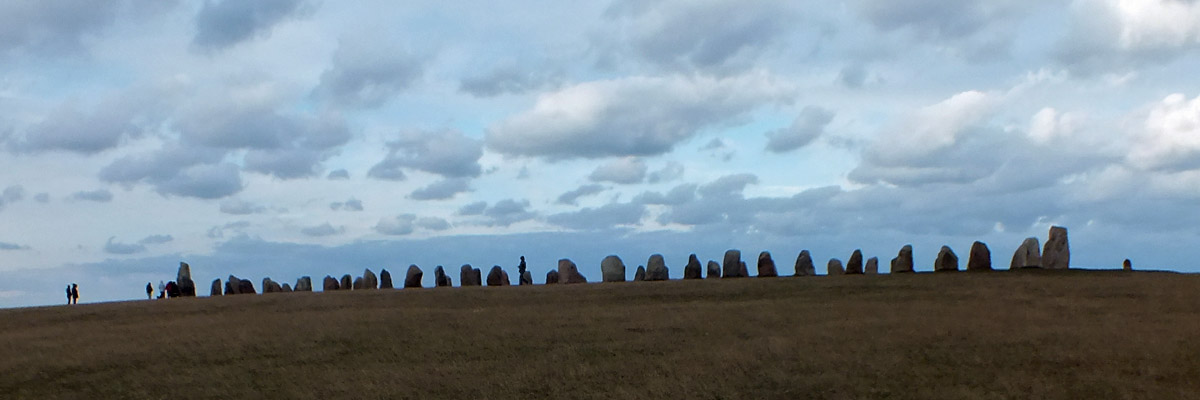 9 October 2015--We drove back into Sweden today, and not far from the town of Ystad visited Ales Stenar, or Ale's Stones. This ship-shaped array of standing stones, 67 meters long, is probably about 1400 years old, although there is evidence that the site was in use thousands of years earlier. The array is aligned to observe the solstices and equinoxes.
