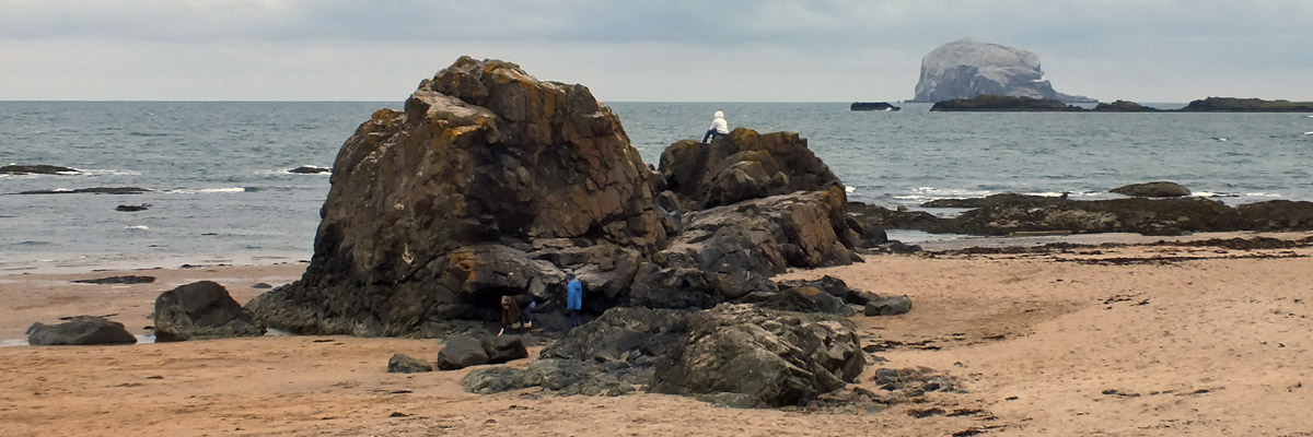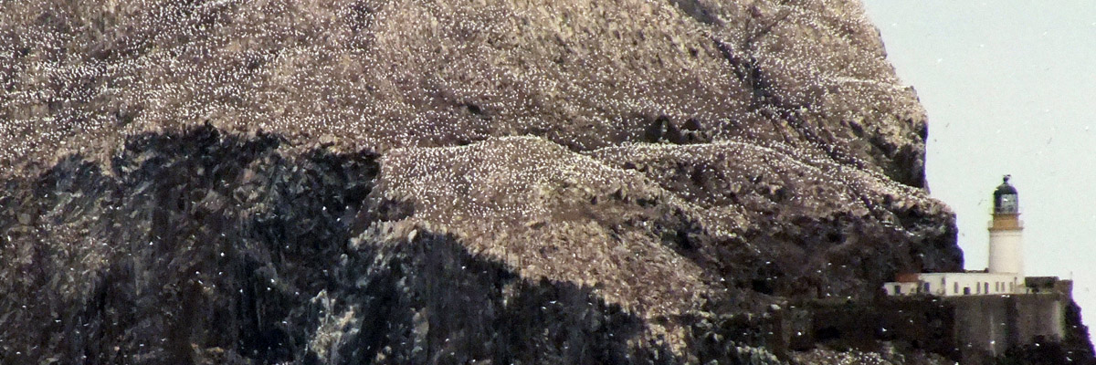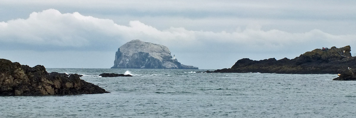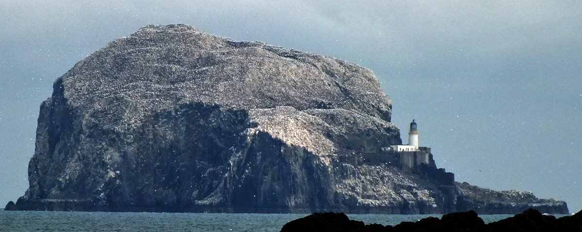 and I visited a brewpub called Aux Fous Brassant in Rivière-du-Loup a short while back. "Fous Brassant" means "brewing fools", but Marc posited that the name was a play on "fou de Bassan", the French name for the sea bird known in English as gannet (Morus bassanus), common across the arc of the North Atlantic, especially concentrated in the British Isles. "Fou de Bassan" means "fool of Bass Rock". And here is Bass Rock as seen from the town of North Berwick, east of Edinburgh on the Firth of Forth. On an overcast day, a ray of sunlight on the rock makes it glow white with the birds and their guano.