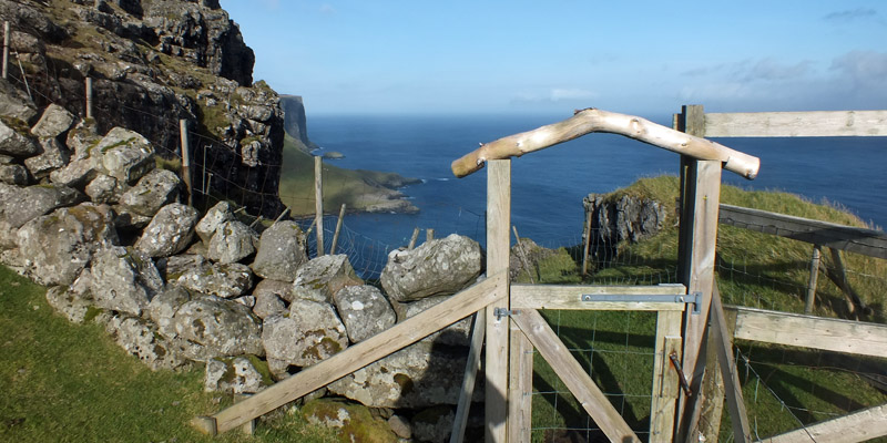 crosses a saddle between two craggy hills back of Tvøroyri, arriving at a gate