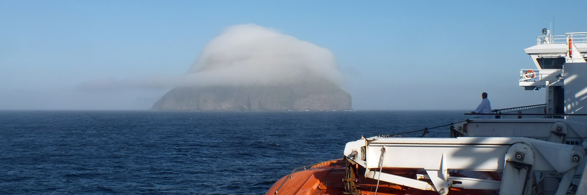 Dímun passing by to port. The islands' misty caps are the only clouds in sight.