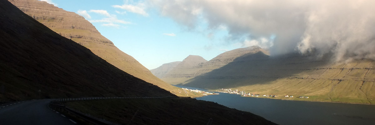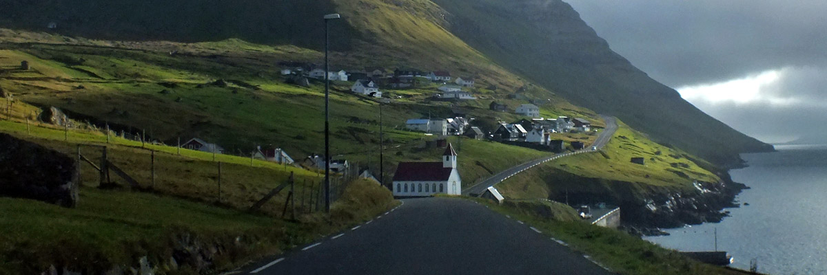 point of Sundini. The road winds across Eysturoy, Føroyar's second-largest