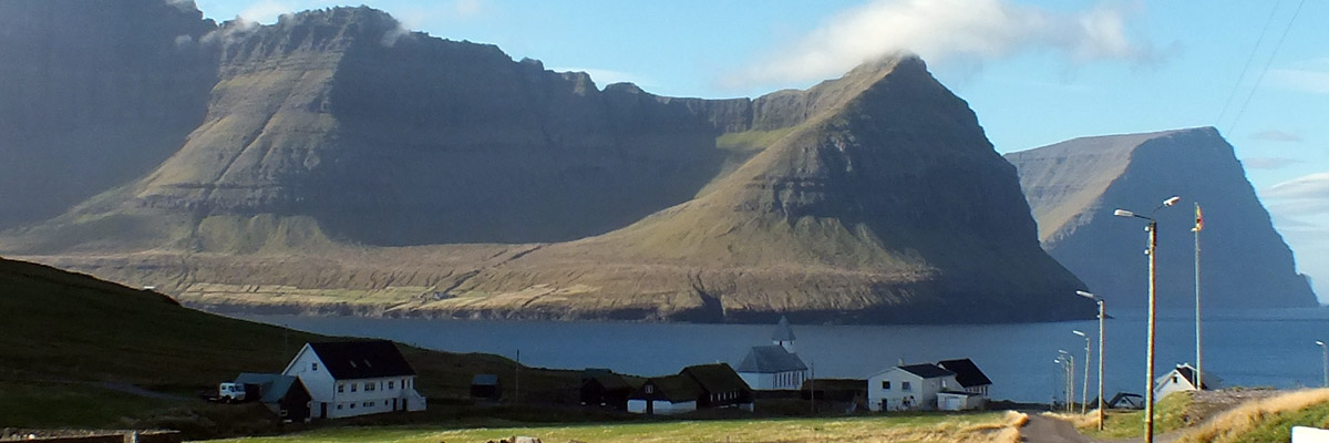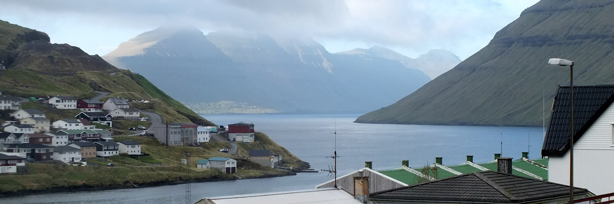 under the blanket of cloud that covers most of Føroyar. Viðareiði is backed by a