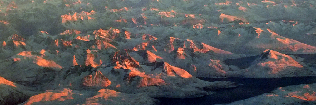 Thursday 27 October 2016--Sunset on Greenland, during the flight home. As usual with aerial photos, this one has been contrast-enhanced.