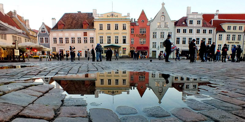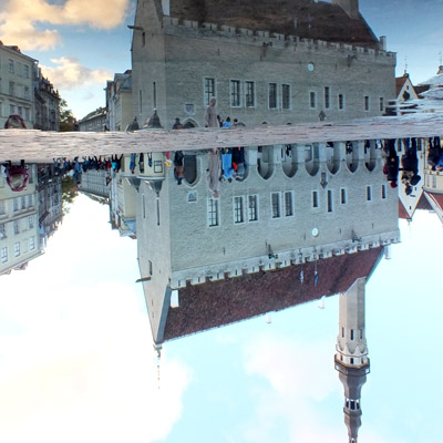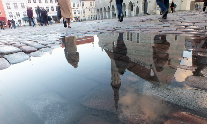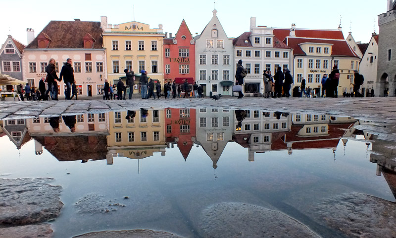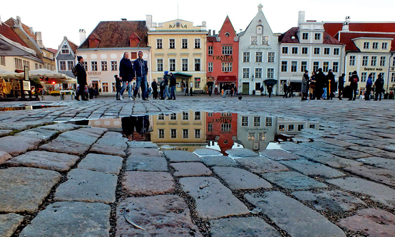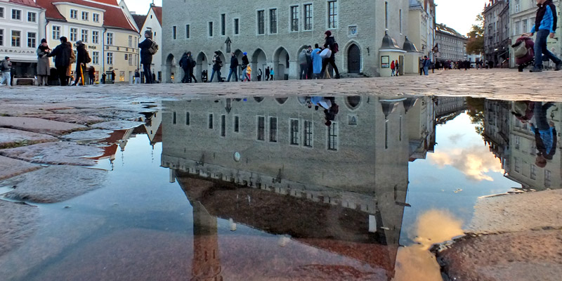 Sunday 7 October 2018--Last day in Tallinn. Spent most of it in the apartment, repacking my luggage, doing some housekeeping, and goofing off. Finally went out at 4:30. At 5:00, the sun came out! By the time I got to the central square, it had dipped behind a cloud again. I spent a considerable amount of time bent down, taking photos of reflections in the puddles around the square. The next thing I know, people all over the square are doing the same. A group of young folks stepped right in front of me while I was lining up a shot, and hogged my puddle for some time. Oh well...at least it wasn't a total waste of my time.