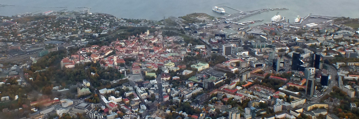 Monday 8 October 2018--When I arrived in Tallinn, I took the tram from the airport into town. All of the tourist literature I'd seen said to pay the driver on board, but the driver was behind a wall and I couldn't see how to approach him, so I never did pay. (It's mostly honor system, with spot checks.) Before I left, I asked around, and was told the same thing--pay the driver. So on my way out, I got on the tram, looked around, and still couldn't see how to pay. So again I didn't. Two stops along, police got on the tram and started checking tickets. Fortunately for me, I was up in the crowded end of the car, and they didn't bother wading in that deep. So here I am making my escape, with a view over Tallinn's Old City. I was picturing the police chasing my plane down the runway, like in Argo, after my two euro fare.