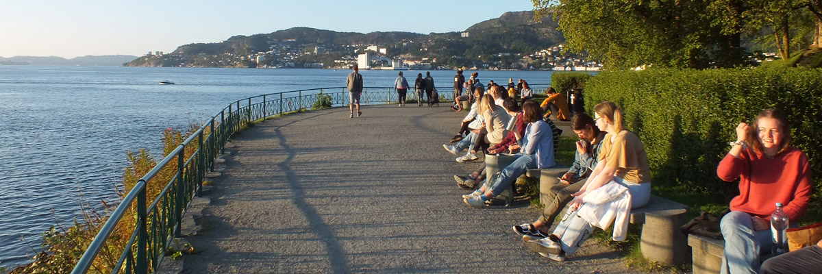 platform, enjoying the sunshine and the view over Bergen and the fjord beyond.