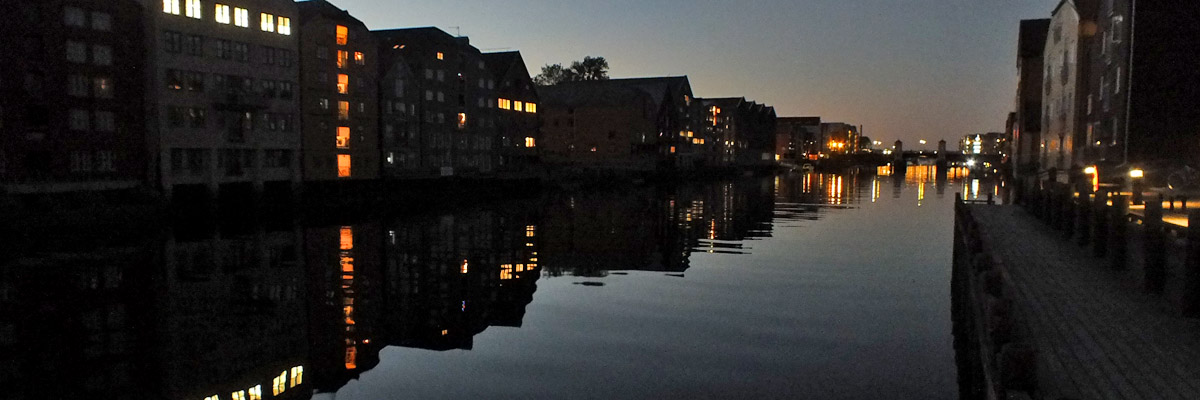 Trondheim lies well inland along its jagged fjord, and the modern waterfront,