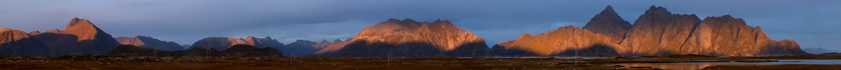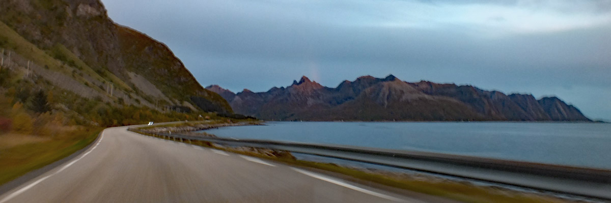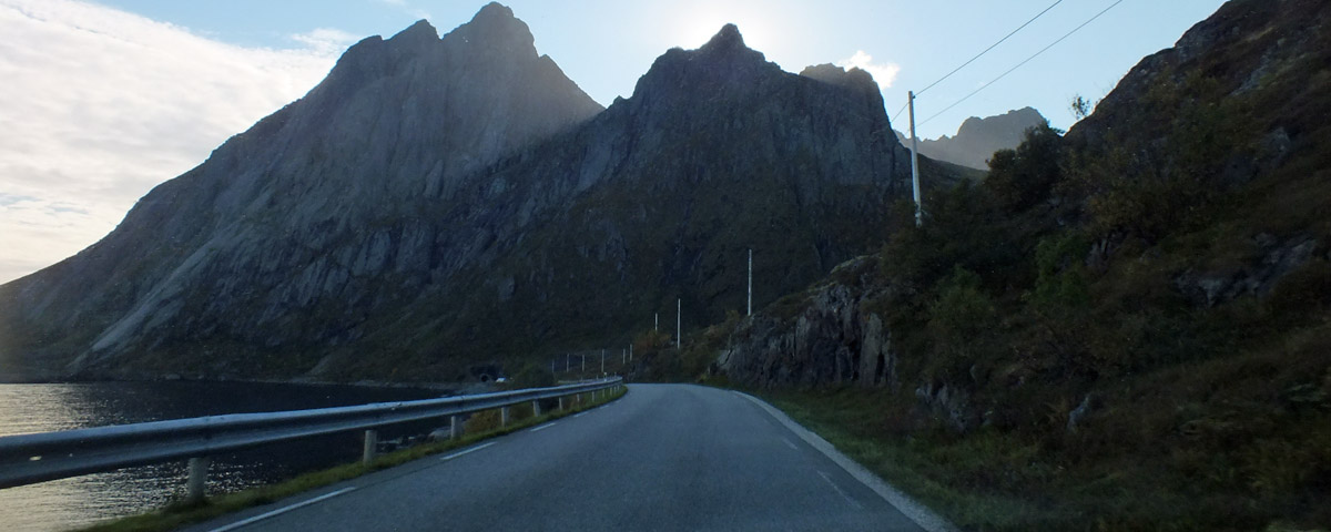I get off the main road, the E10, at Leknes, and take the alternate coastal route, the 815, on the way back to Henningsvær. I'm treated to the light of the setting sun on the mountains across the water. I've had a good day, but I know it would have been a lot better if I'd gotten out early. All these years of thinking about this trip, and I'm not really on the beam here.