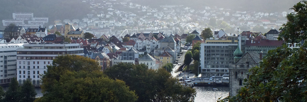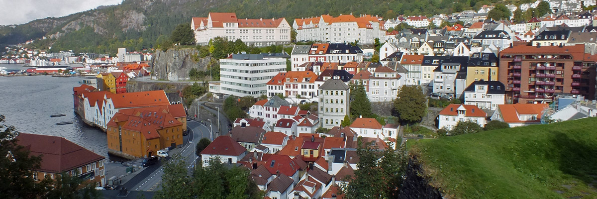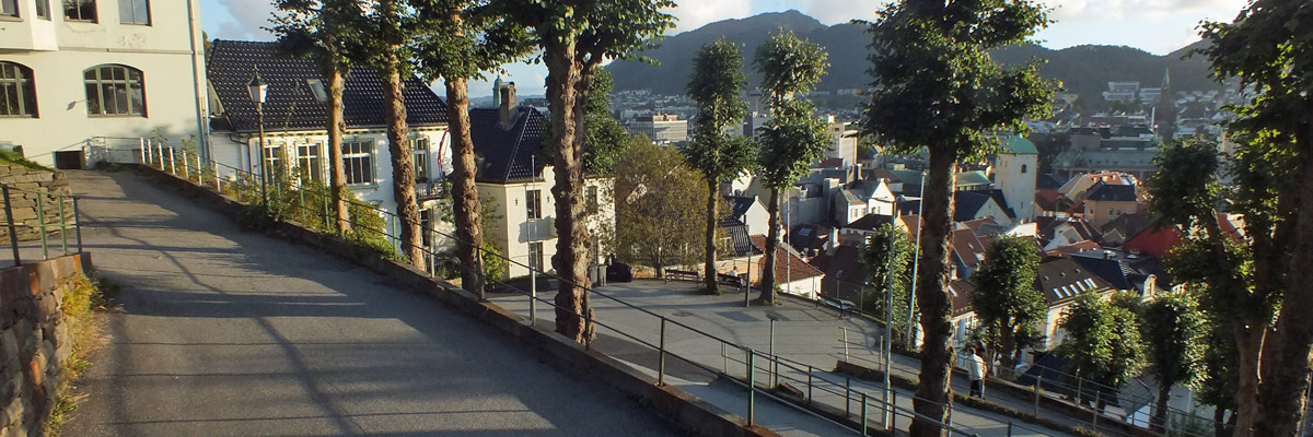 the mountain Fløyen. The switch-backing street above the Fløibanen terminal is