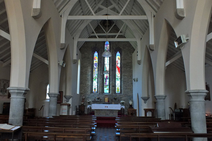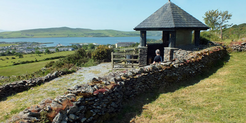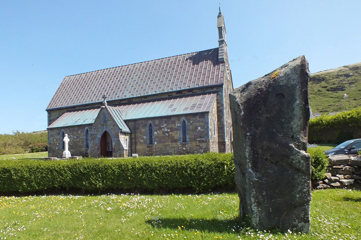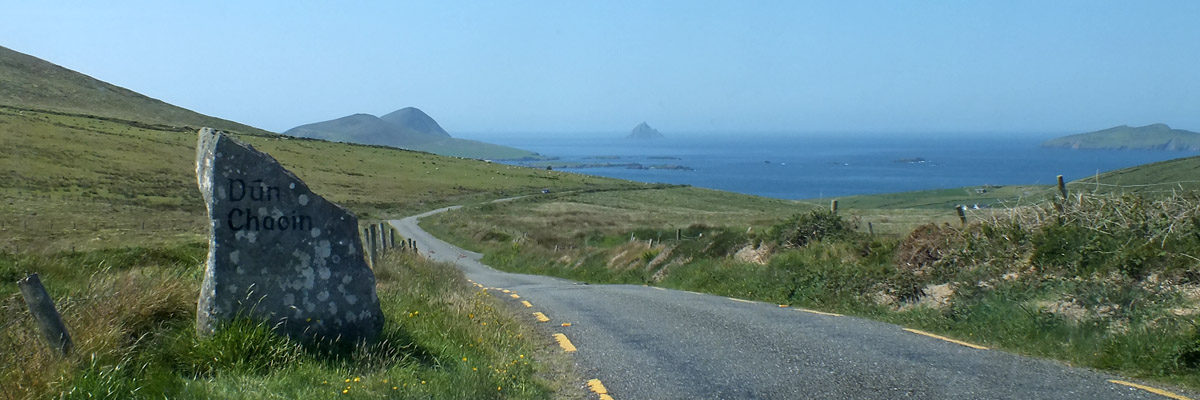 We visit Clogher Strand, a sheltered beach with a view out to the Sleeping Giant, and then stop in Ballyferriter to see the Church of St Vincent, where Bobby's great-grandparents were married, and his grandfather baptized. Across the street, in front of the West Kerry Museum, stands an ancient cross stone...only it's not ancient, and it's not stone. Bobby knocks on it to demonstrate that it's hollow, a fiberglass prop that was used in the movie Ryan's Daughter. Filmed in 1969, the David Lean epic injected a large amount of cash directly into the economy of what was then a poor part of a poor country, and initiated a wave of tourism that has grown steadily since. And here we are.