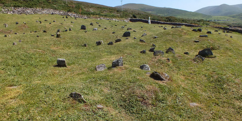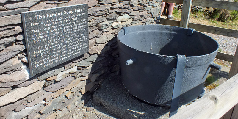 Tuesday 30 May 2023--There is plenty to see around the Dingle Peninsula, and we have an excellent guide (that would be Bobby) who wants to show us things that are a bit off the usual tourist trail. He starts by taking us to a Famine cemetery on a hillside above town. "I thought this would be a pleasant way to begin a trip," says he. Can't go wrong with social catastrophe. The Great Famine of 1845-52 is perhaps the central event in modern Irish history, with widespread and long-lasting consequences. It hit hardest in this southwest part of the country. Everyone knows that potato blight was the nominal cause; the dependence of tenant farmers on that single crop barely hints at the policies and practices that brought the disaster about. The arrogance and callousness of the British government and absentee English landlords is almost beyond belief.