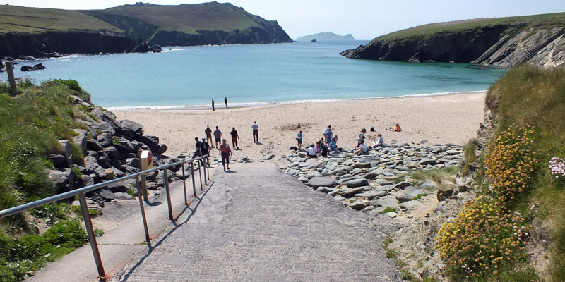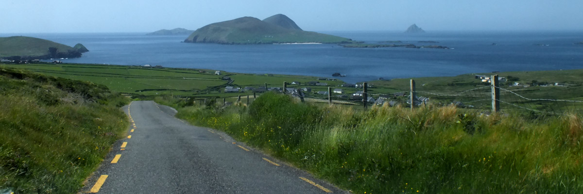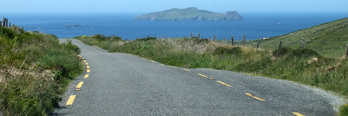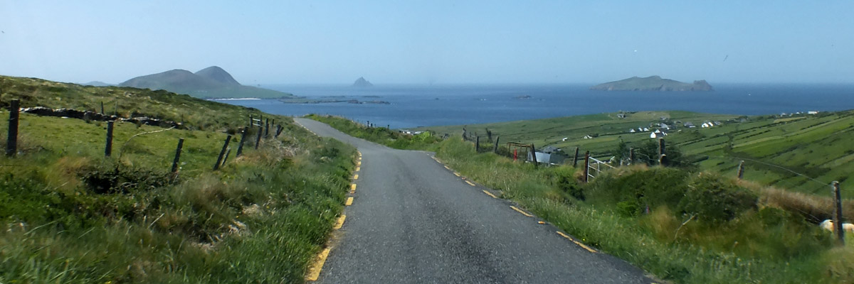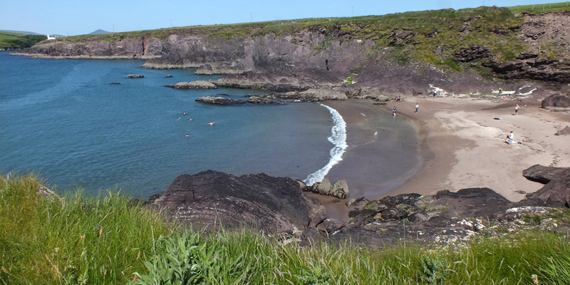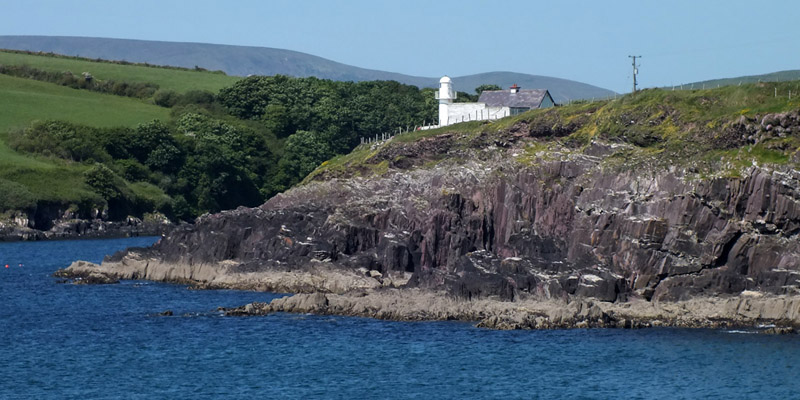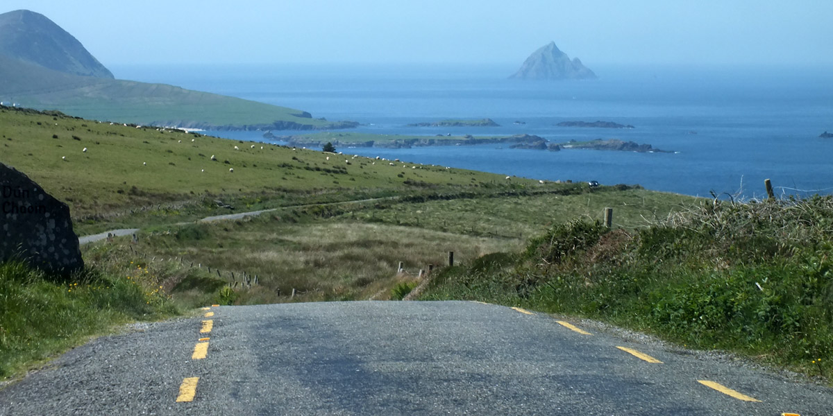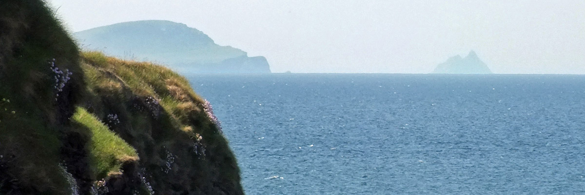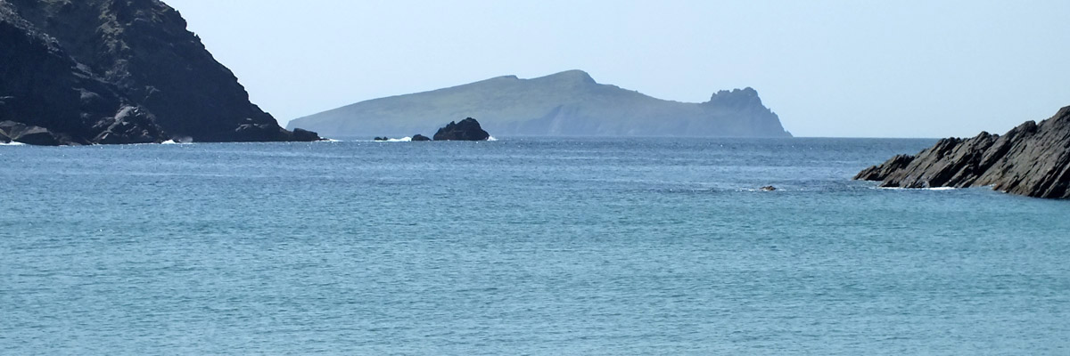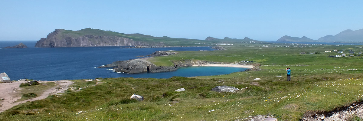 Uh, that wasn't very cheerful. Our next stop is the beach at Bín Bán (or Binn Ban or Beenbane or Beenbawn), just outside Dingle Harbour. (I do not immediately find any horrible historical facts about this beach, which of course does not mean that none exist.) We can see Dingle Lighthouse, built in 1885, at the mouth of the harbor, and Eask Tower on the hill across the water. The tower was a Famine-era make-work project, serving as a navigational beacon for sailors looking for the somewhat obscure entrance to the harbor. It's a clear enough day for us to spot Skellig Michael, 27 miles to the south.